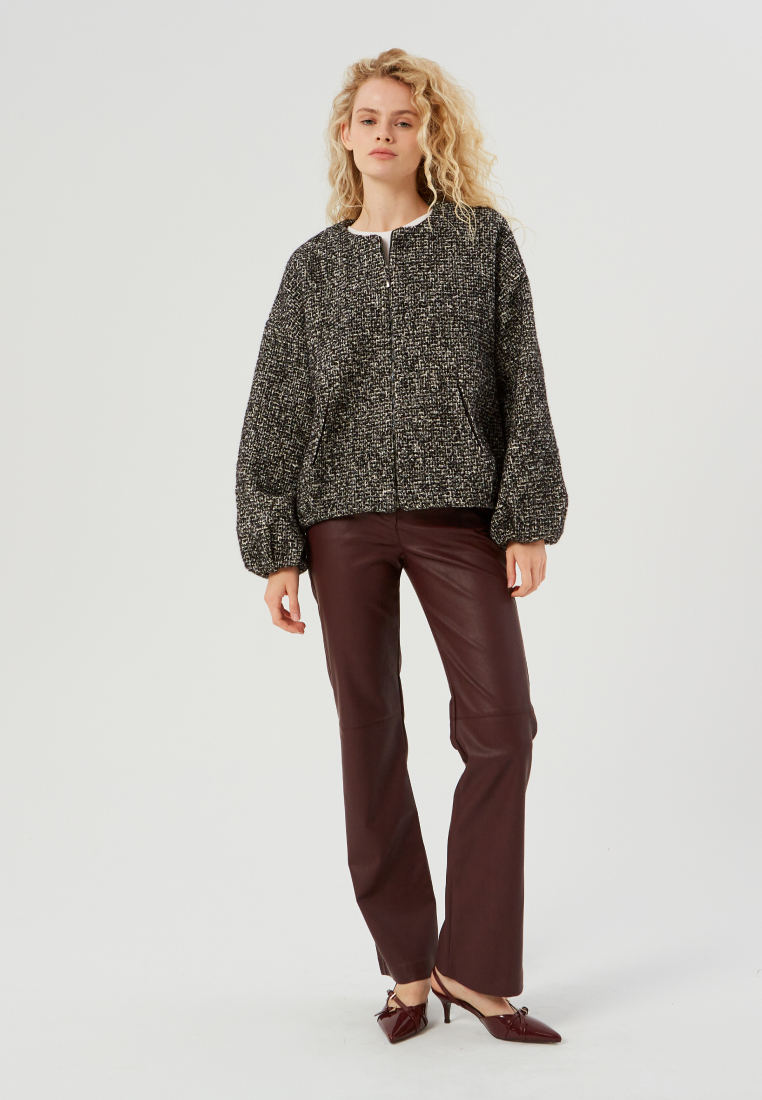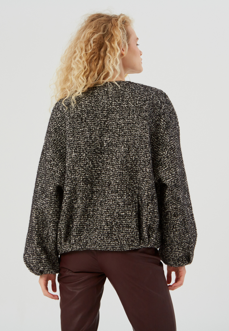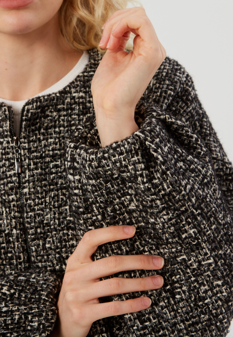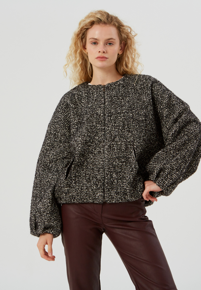 Объемный бомбер со спущенными плечами и прорезными карманами выполнен из стоковой итальянской фактурной ткани. Застегивается на молнию. Изделие на подкладке. Бомбер отлично сочетается как с классическими брюками и юбками, так и с джинсами.