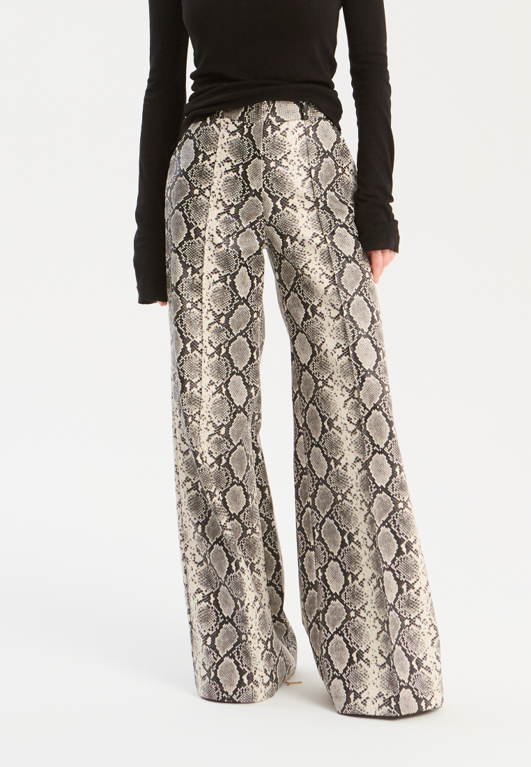 Брюки с высокой посадкой и свободным чуть расклешенным книзу кроем, выполненные в выразительном анималистичном принте. Чёткая линия талии и удлинённый силуэт создают эффектный и собранный образ.