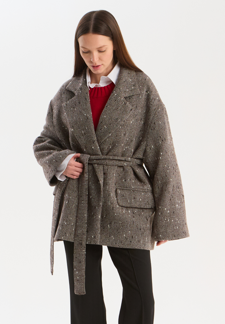 Объёмное пальто-жакет из фактурного твида с деликатным вкраплением. Свободный крой и мягкая линия плеч создают расслабленный силуэт, а пояс позволяет варьировать посадку — от свободной до подчеркнуто женственной.