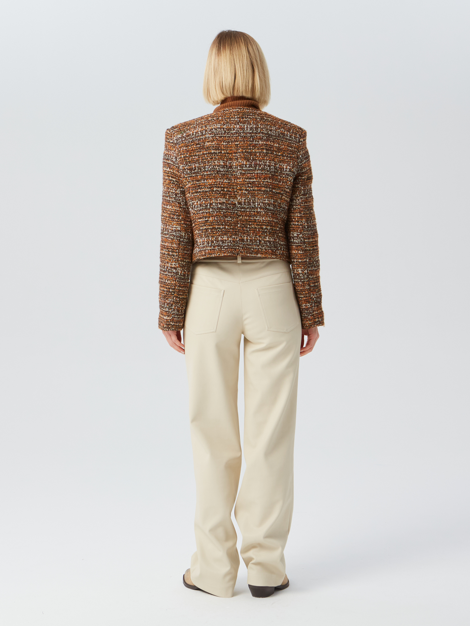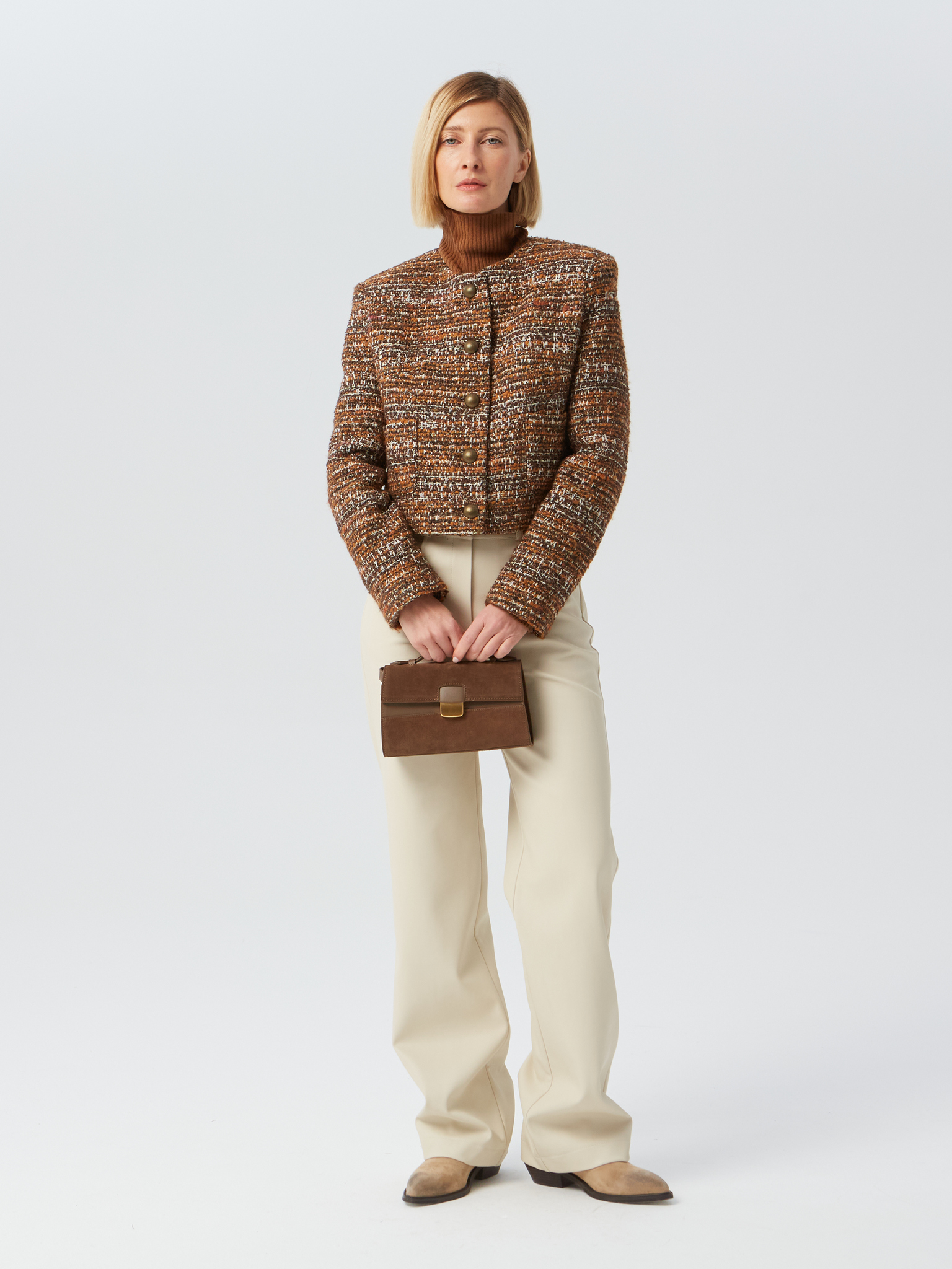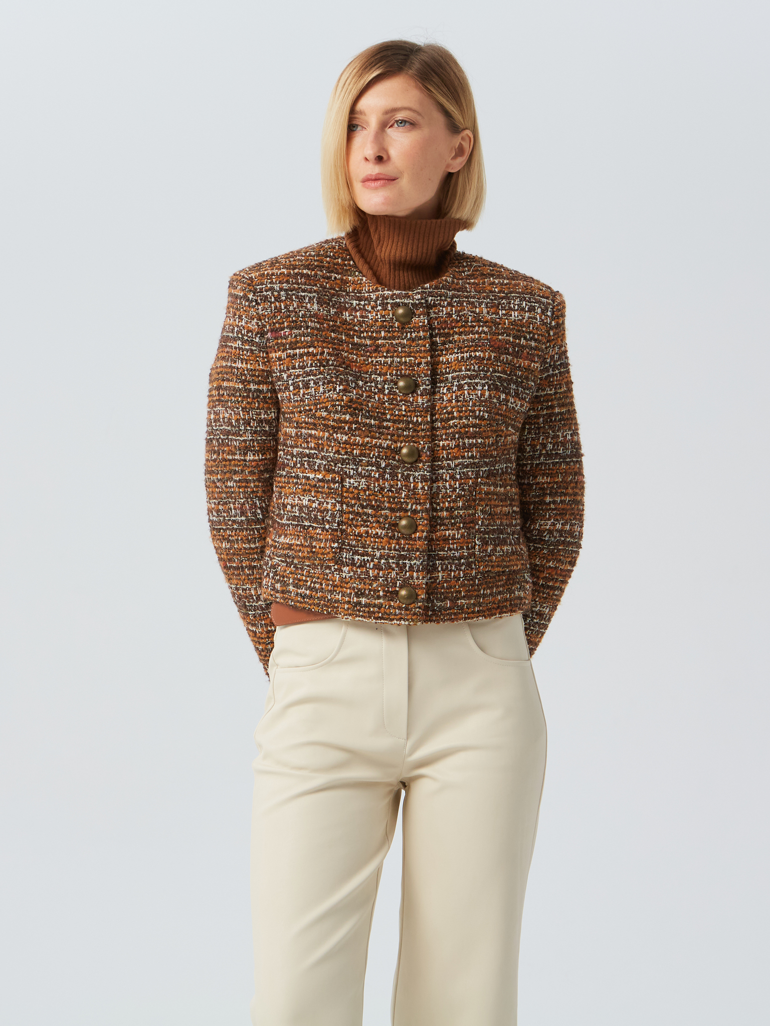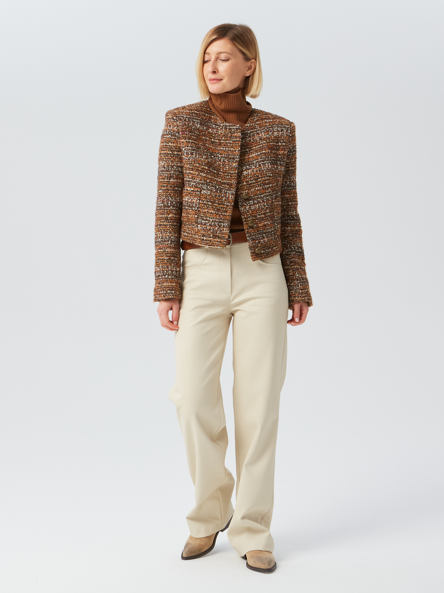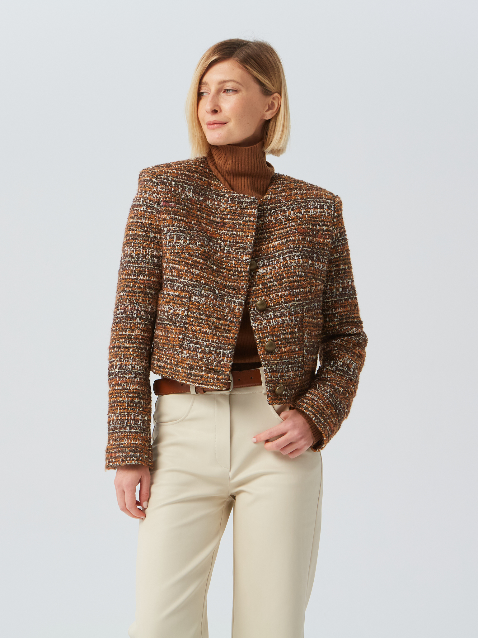 Укороченный твидовый жакет с объемными плечами и накладными карманами выполнен из стоковой итальянской фактурной ткани. Застежка на 5 пуговиц. Изделие на подкладке. Жакеты отлично сочетаются как с классическими брюками, так и с джинсами.