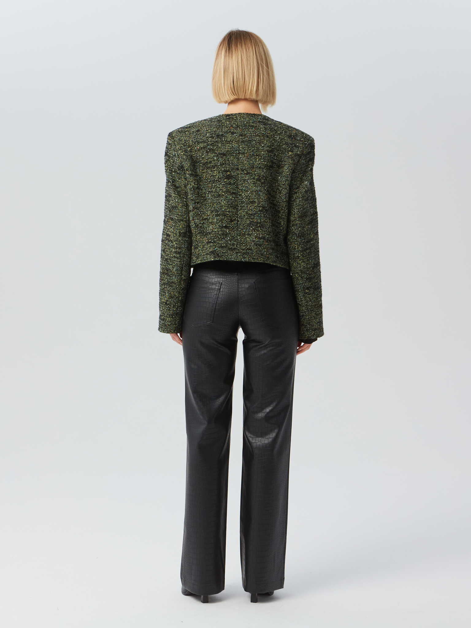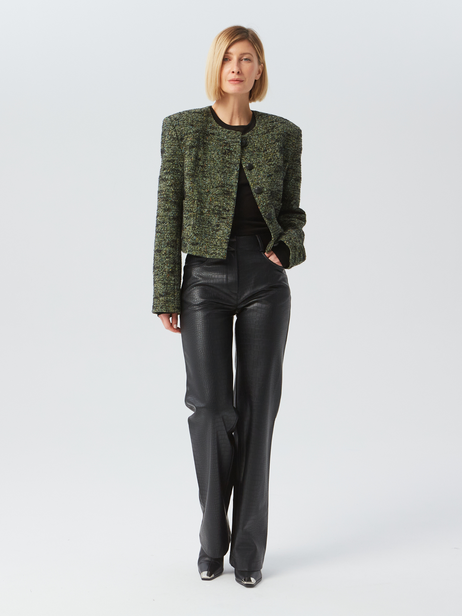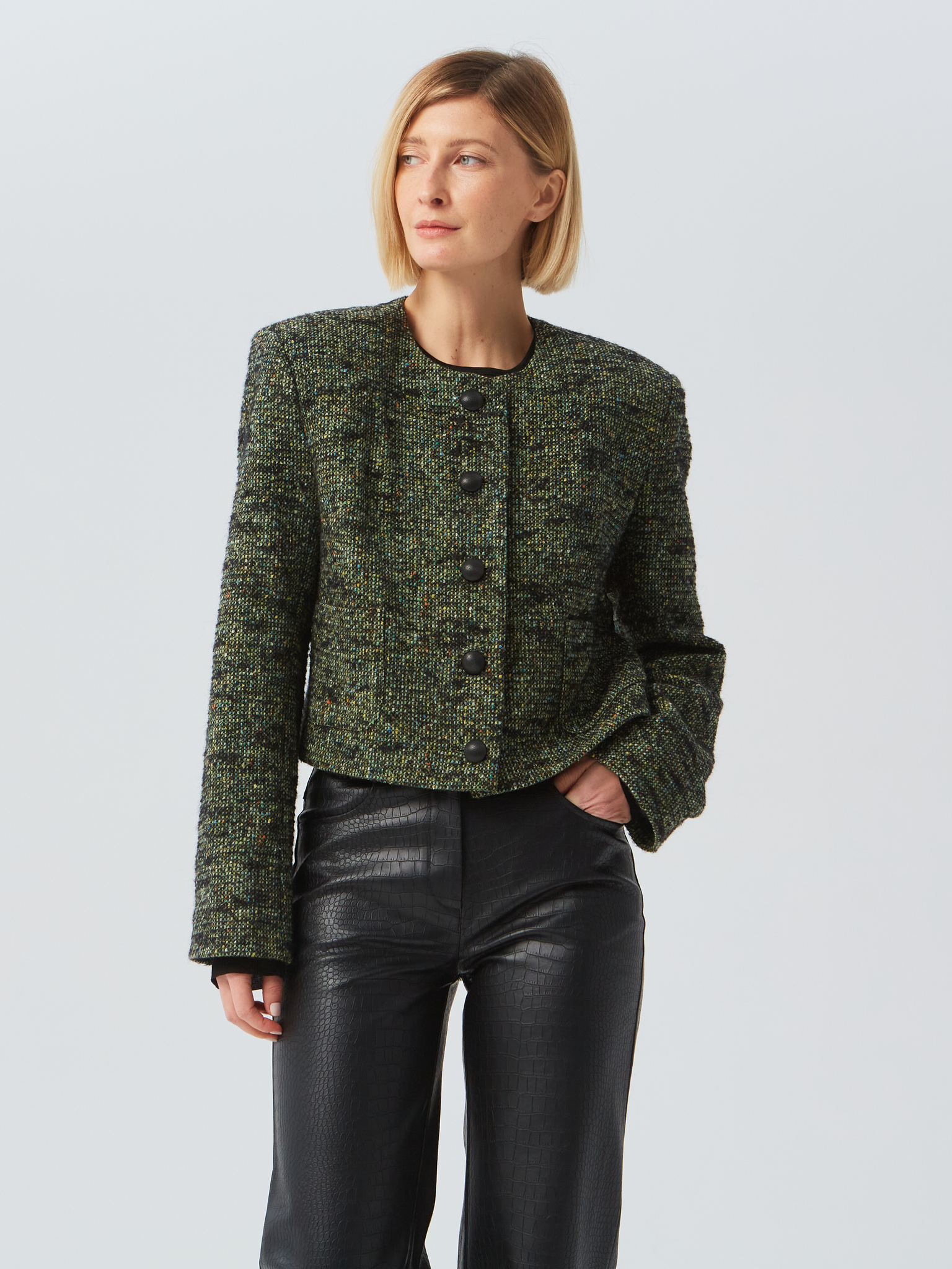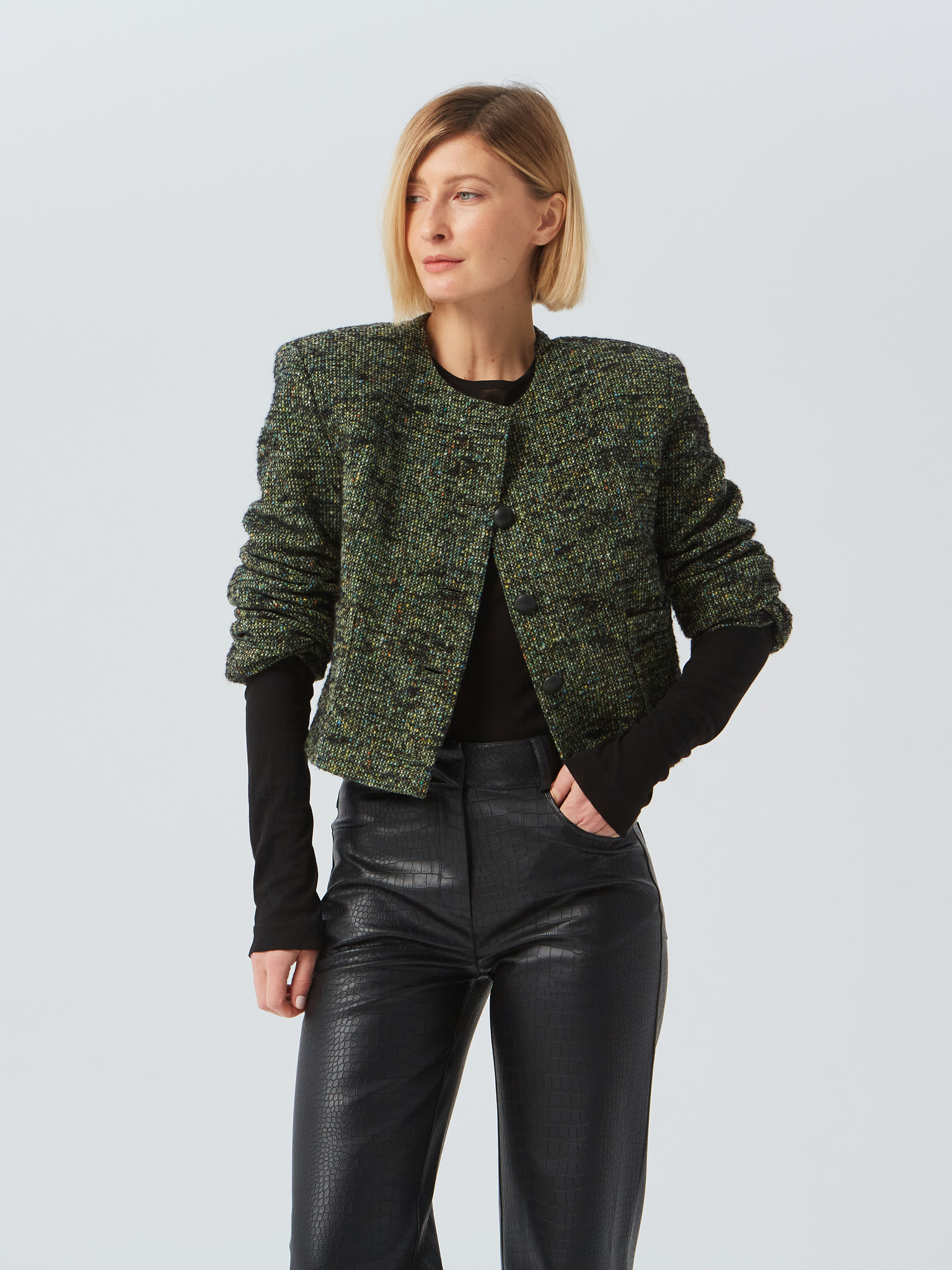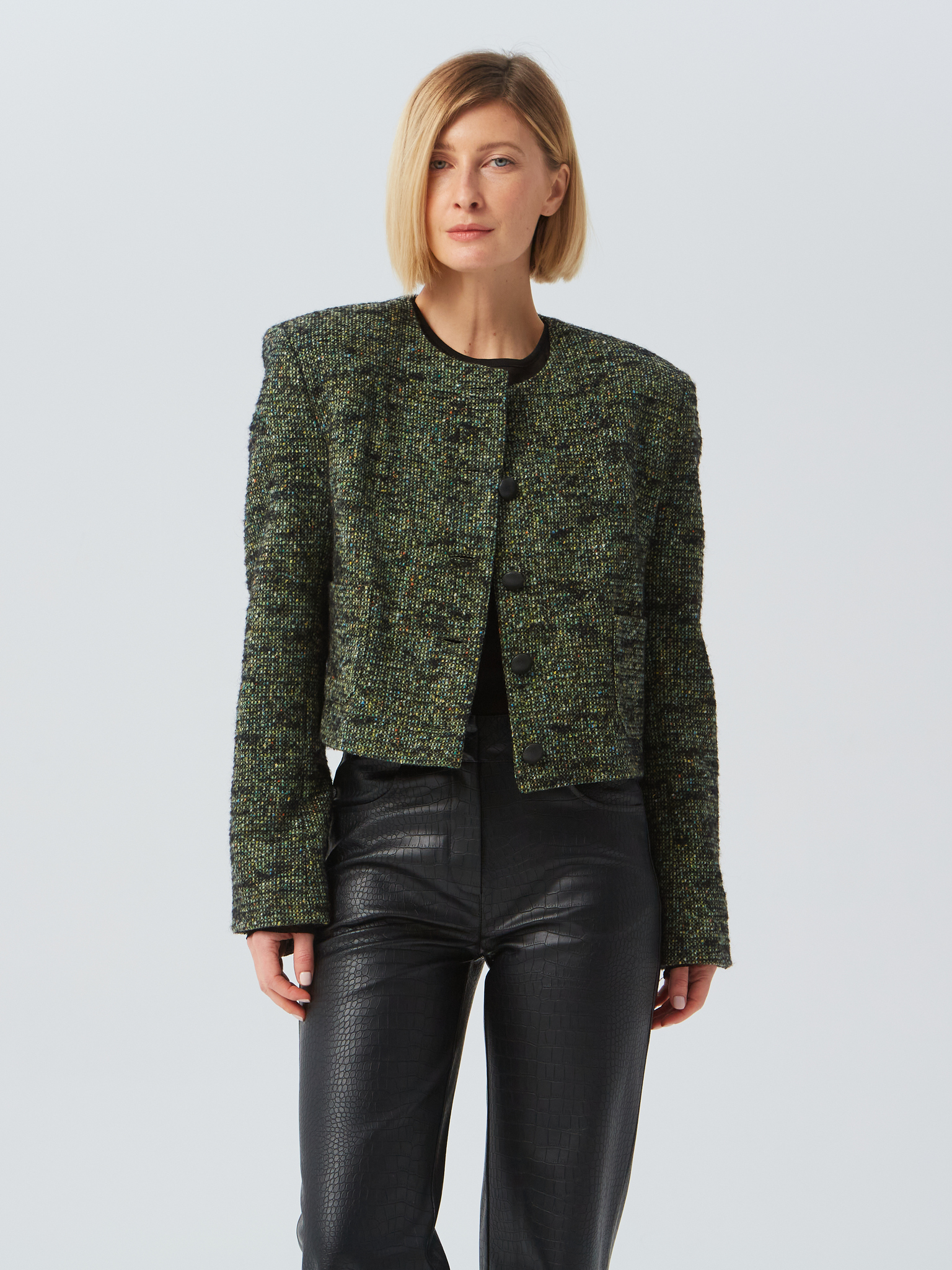 Укороченный твидовый жакет с объемными плечами и накладными карманами выполнен из стоковой итальянской фактурной ткани. Застежка на 5 пуговиц. Изделие на подкладке. Жакеты отлично сочетаются как с классическими брюками, так и с джинсами.